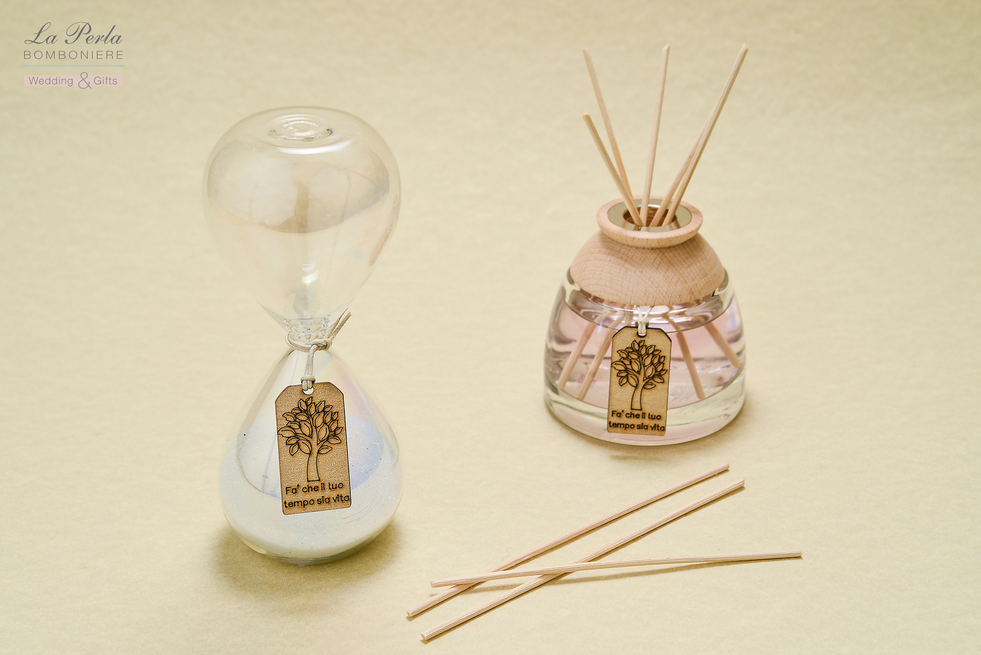 Clessidra dal vetro iridescente e Profumatore con profumo alla violetta. Tema albero della Vita con incisa la frase “Fa che il tuo tempo sia vita”. Made in Italy.